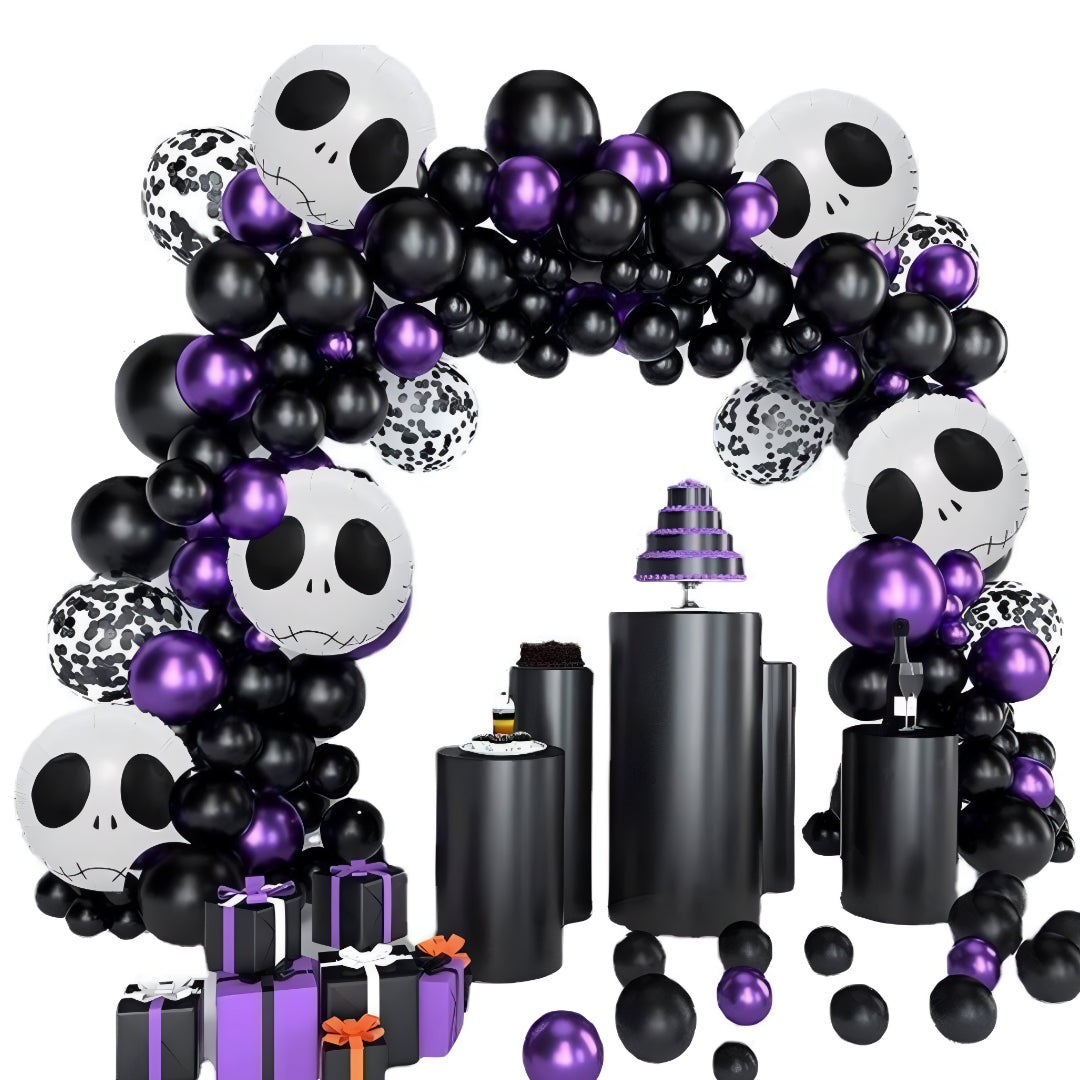 Set Incluye: 5 globos de cara Jack de 18 pulgadas, 5 globos de punto negro de 12 pulgadas, 80 globos negros de 10 pulgadas, 20 globos morados de 10 pulgadas, 30 globos negros de 5 pulgadas, 1 rollo de pegamento distribuidor, 1 rollo de cinta adhesiva, un juego de corbata para globos.