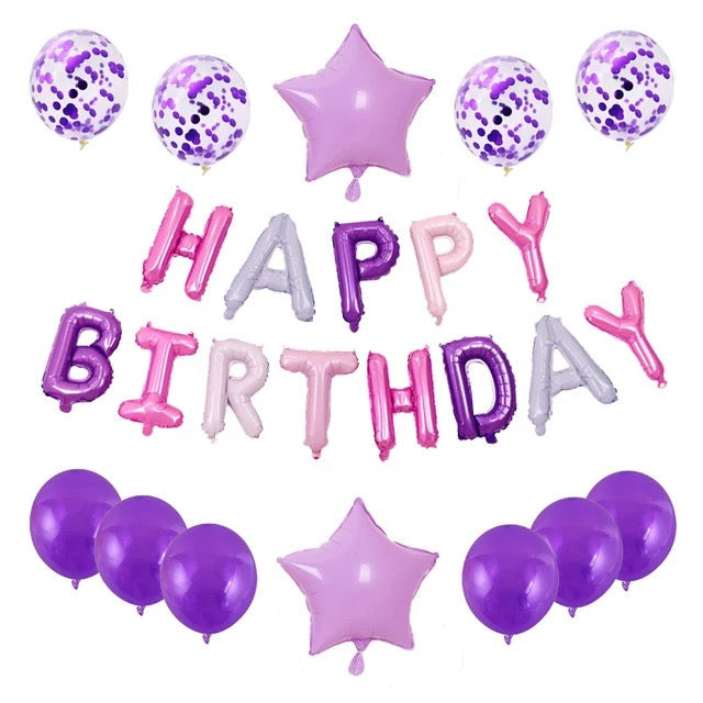 Letrero Happy Birthday lila con 10 globos de látex y 2 estrellas.